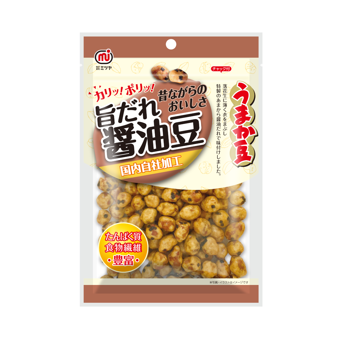 落花生に薄く衣をまぶし、特製のあまから醤油だれで味付けしました。カリッポリっとした食感と昔ながらの美味しさが楽しめます。たんぱく質と食物繊維が豊富に含まれています。